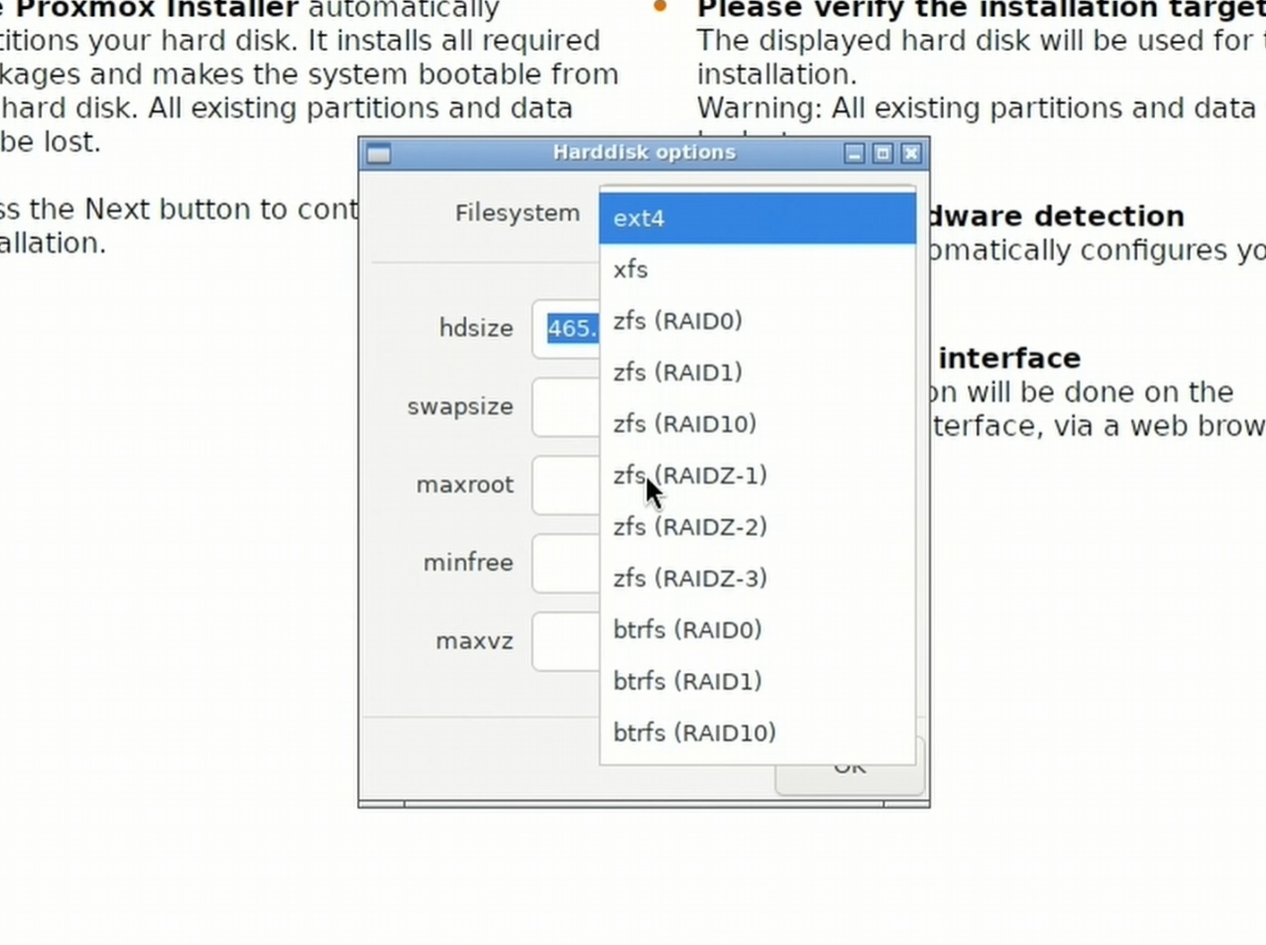 • After clicking “Options”, change the filesystem to “ZFS (RAID1)”.