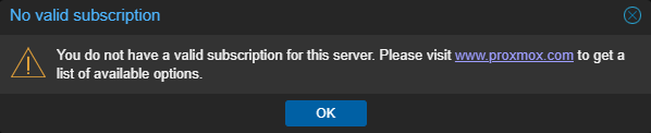 • The first thing you will see is a nag message stating that you do not have a valid subscription for your server. This is expected since we are using Proxmox for personal use and don’t have an enterprise subscription. Simply ignore this message and click OK for now, we will disable this nag message in just a moment.