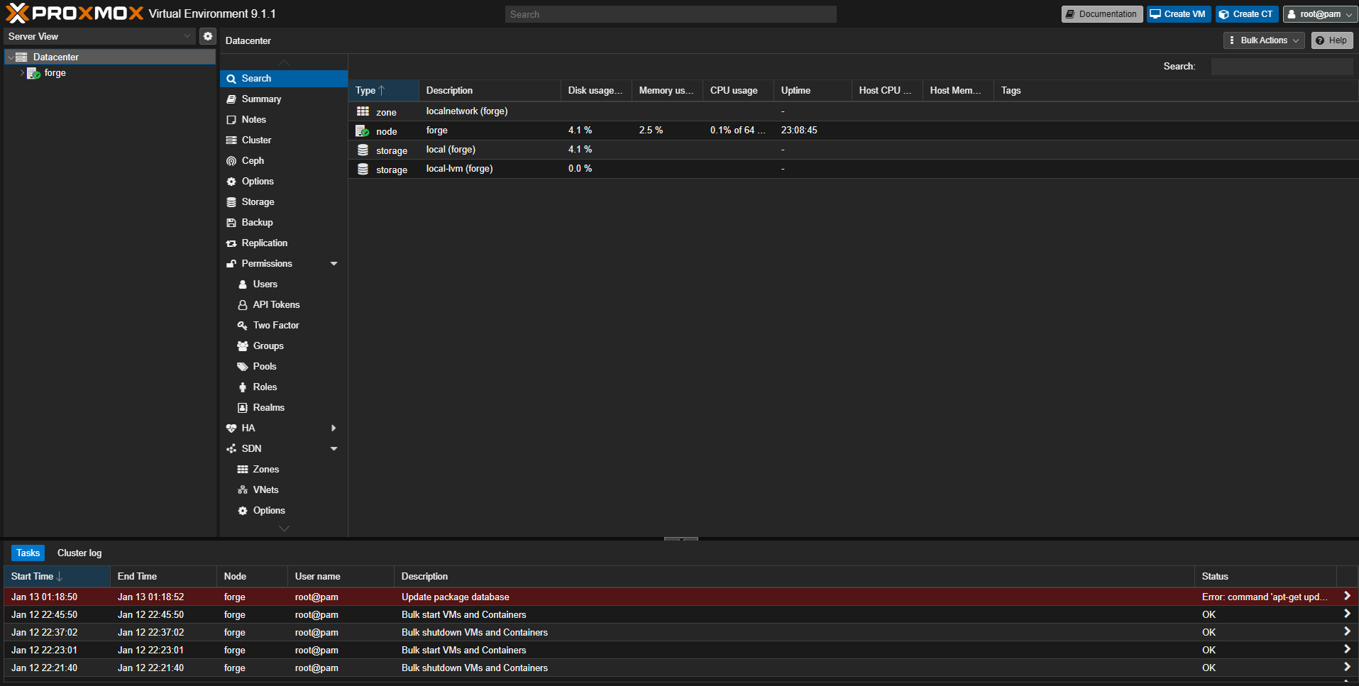 • You are now logged into the Proxmox web UI for your server.